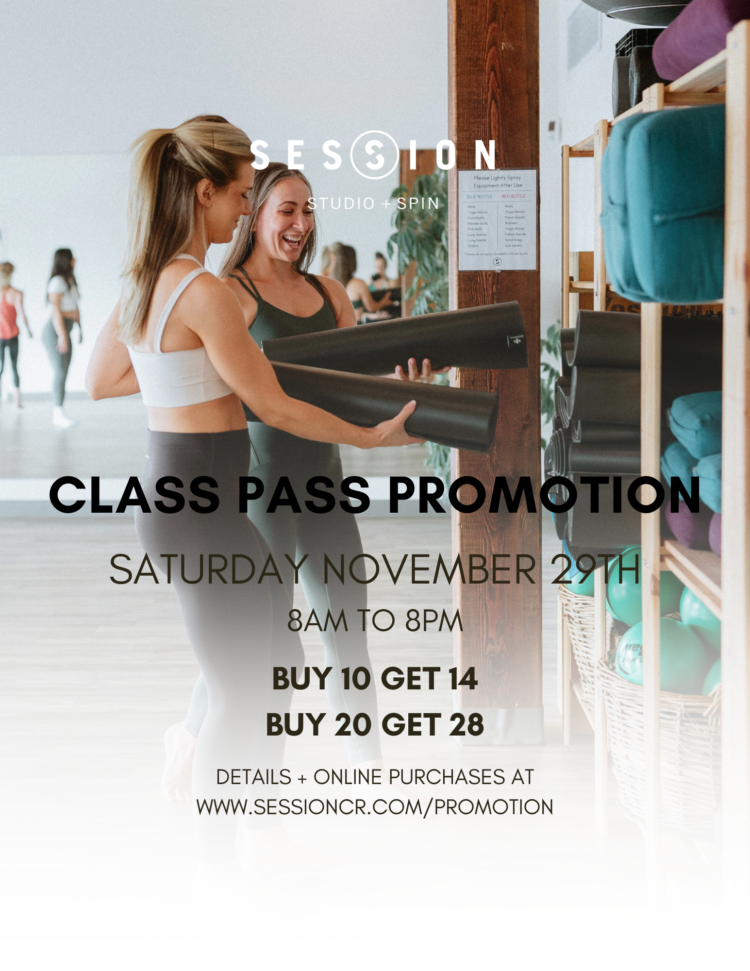 Gain access to the extensive range of Session Studio + Spin classes with our All-Access Class Passes and receive bonus classes on Saturday, November 29th ONLY!