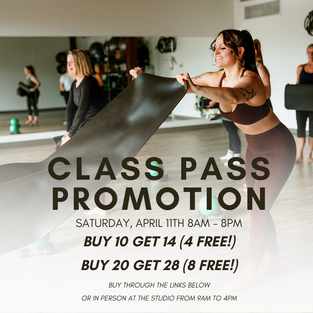 *Gift Certificates DO NOT work with Momence. If you are looking to use a Gift Certificate towards your purchase for this promotion, please email a photo of it to our reception team by 1pm on Friday, April 10th so they can load it onto your account or come by in-person on Saturday before 4pm!